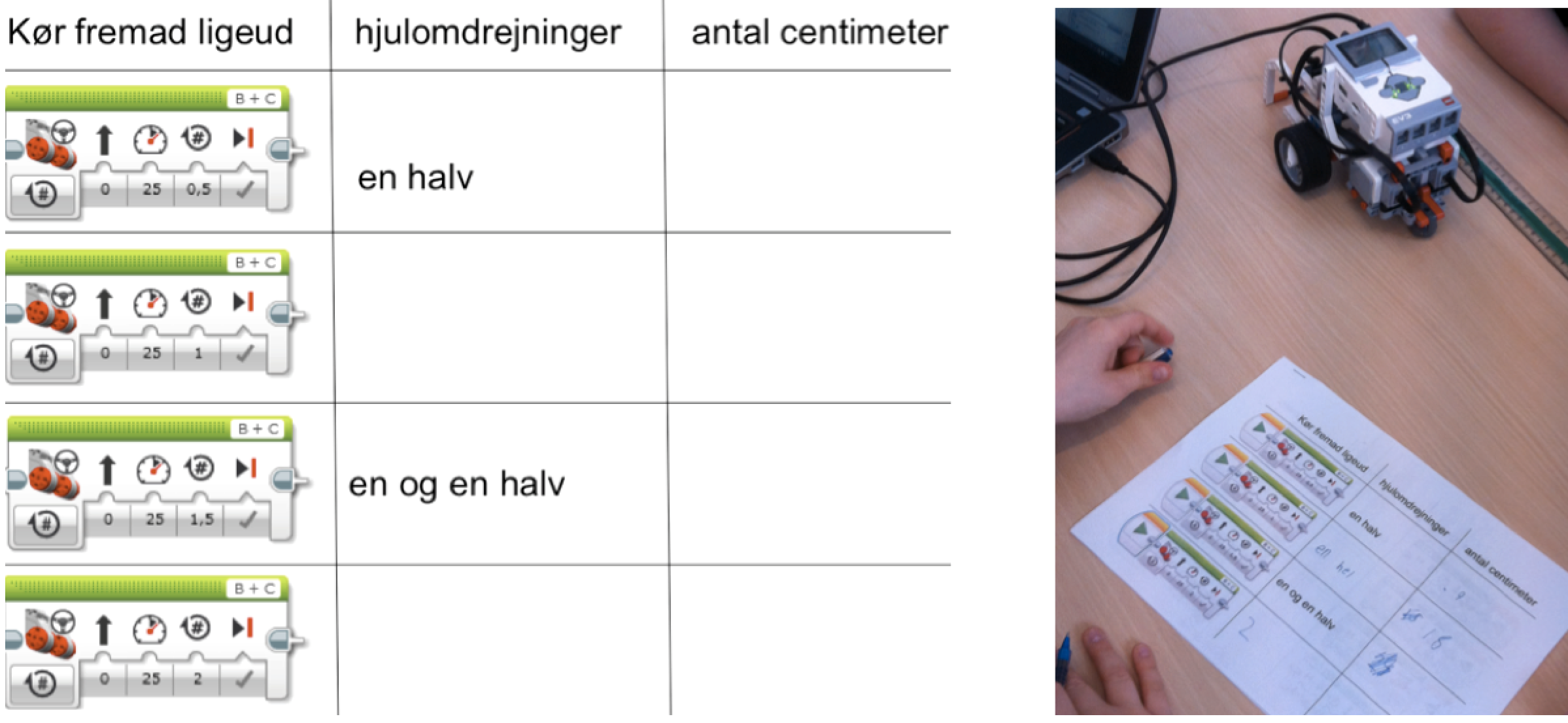 Opgave 2: Prøv at sætte flere bevægelsesstyring-blokke efter hinanden og få på den måde robotten til f.eks. at køre et stykke frem og så bakke det samme stykke tilbage.