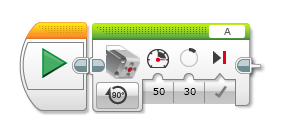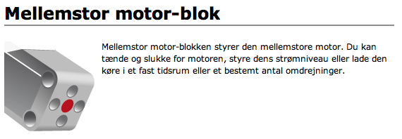 Opgave 3: For at få en fornemmelse af hvor lang en strækning målt i centimeter robotten kører ligeud afhængig af antal hjulomdrejninger, lav da kørsler med forskellige antal hjulomdrejninger, som f.eks. vist i dette skema:Udfyld f.eks. de tre skemaer i opgaveark (PDF fil) så fremad og tilbage kørsler undersøges. Og det undersøges også, hvor meget robotten drejer på stedet afhængig af hjulomdrejninger. Programmering af redskabsmotorPrøv nu at undersøge, hvordan redskabsmotoren på robot basen bevæger armen. Brug et simpelt program med blot en programmeringsblok, en mellemstor motor-blok:Redskabsmotoren er sat til at dreje 30 grader med Strøm 50. Stil armen sådan her: Så kan det ses om armen drejer op eller ned. Opgave 4:Måske er det en idé at kigge i EV3 hjælp for mellemstor motor-blok: |