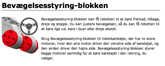 Programmering af kørsel med basePrøv nu at se, hvordan robot basen kører ved at bruge et simpelt program med blot en programmeringsblok, en bevægelsesstyring-blok:Programmet får robotten til at køre fremad: Hjulene roterer en omdrejning inden robotten stopper. Hold øje med den hvide "pil" inde i hjulene, som viser, at der netop køres en omdrejning. Opgave 1: De forskellige indstillingsmuligheder i bevægelsesstyring-blokken er beskrevet i EV3 hjælp. Find beskrivelsen ved i programmeringsværktøjet at gå ind i Vis EV3 hjælp: Vælg dernæst Programmeringsblokke og under Handlingsblokke vælg Bevægelsesstyring: